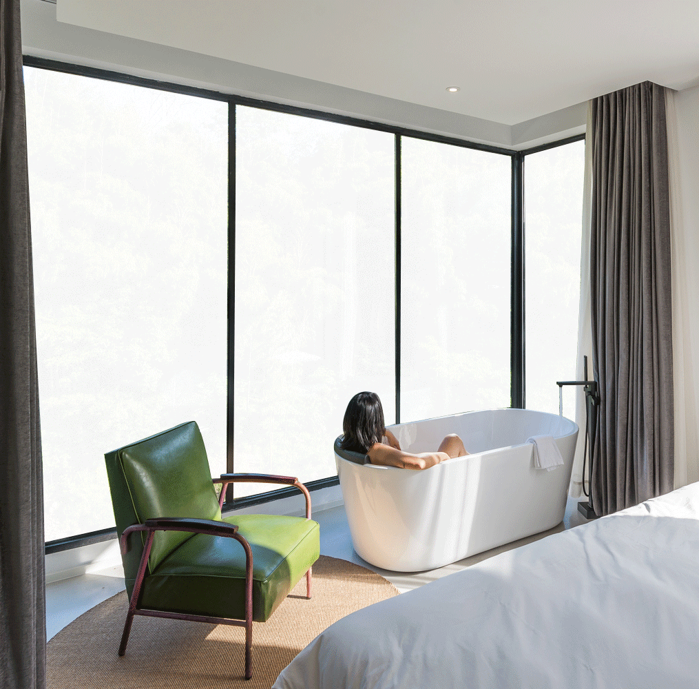 - Bez napětí (vypnuto): Když není elektrické napětí, tekuté krystaly ve fólii nejsou uspořádané, což způsobuje její neprůhlednost. To poskytuje vysokou úroveň soukromí, ideální pro konferenční místnosti, kanceláře, obchodní výlohy, ložnice nebo koupelny.